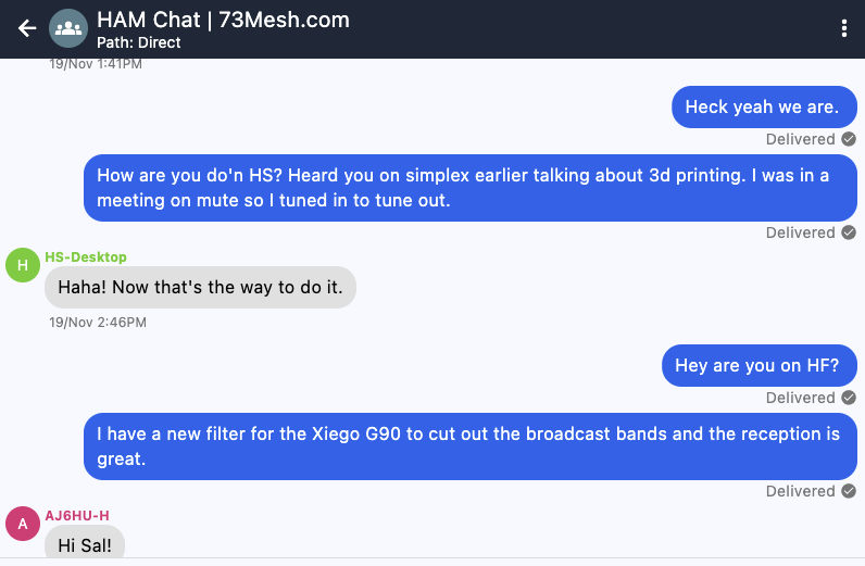 In this example, you can see an actual conversation happening on the “HAM Chat | 73Mesh.com” room server. Users are discussing ham radio topics—someone mentions 3D printing and HF operations, another user talks about a filter for the Xiego G90 radio.