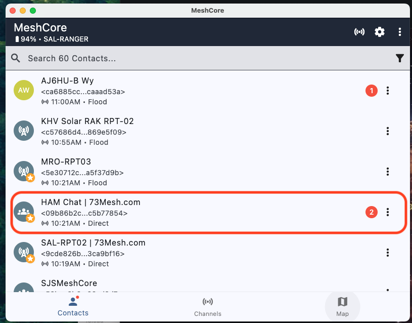In the screenshot above, you can see several nodes in the contacts list, including “HAM Chat | 73Mesh.com”—a room server that’s been set up specifically for amateur radio operators to exchange messages. Notice how it shows up with a distinct icon and indicates it’s a “Direct” connection type. Other room servers like “SAL-RPT02 | 73Mesh.com” might serve different purposes or communities.