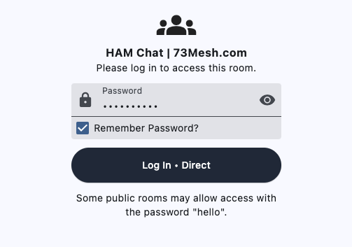 Guest Access - Password-protected (default: “hello”) allowing users to post messages to the room and retrieve their missed messages. This is your standard user level.